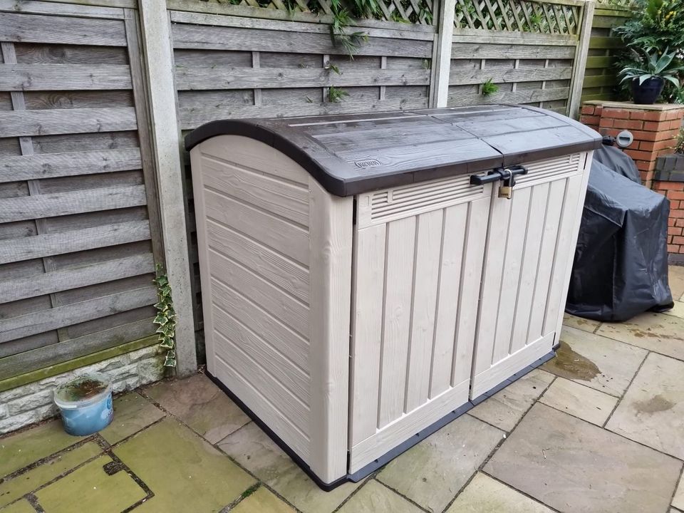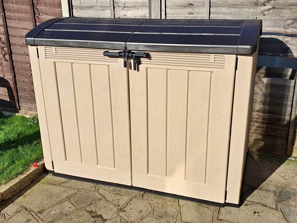 - Ideal outdoor storage solution for garden tools and equipment, BBQ and accessories, bicycles and x2 360 Litre or three 120 Litre wheelie bins